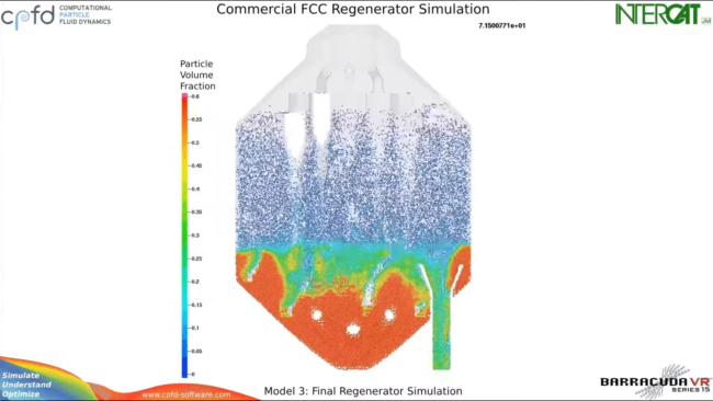 A model of a full-scale fluidized catalytic cracking (FCC) regenerator using the Eulerian-Lagrangian CPFD method in Barracuda VR. This video illustrates the use of the Barracuda Virtual Reactor to predict the 100°F afterburn observed at the refinery.