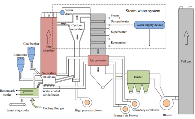 This video, from the CFBC Application Model, shows the initial fluidization of particles in the riser as well as the distribution of coal particles in the system.