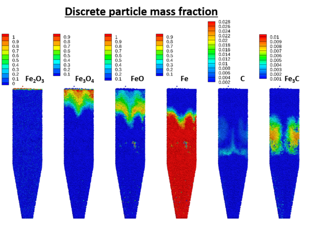 This application model uses Barracuda Virtual Reactor to simulate the direct reduction of iron ore in a MIDREX-style shaft furnace. The simulation tracks moving bed hydrodynamics and reduction reactions between iron oxide particles and a hydrogen–carbon monoxide gas mixture, enabling evaluation of solids conversion, gas species evolution, and furnace temperature profiles.