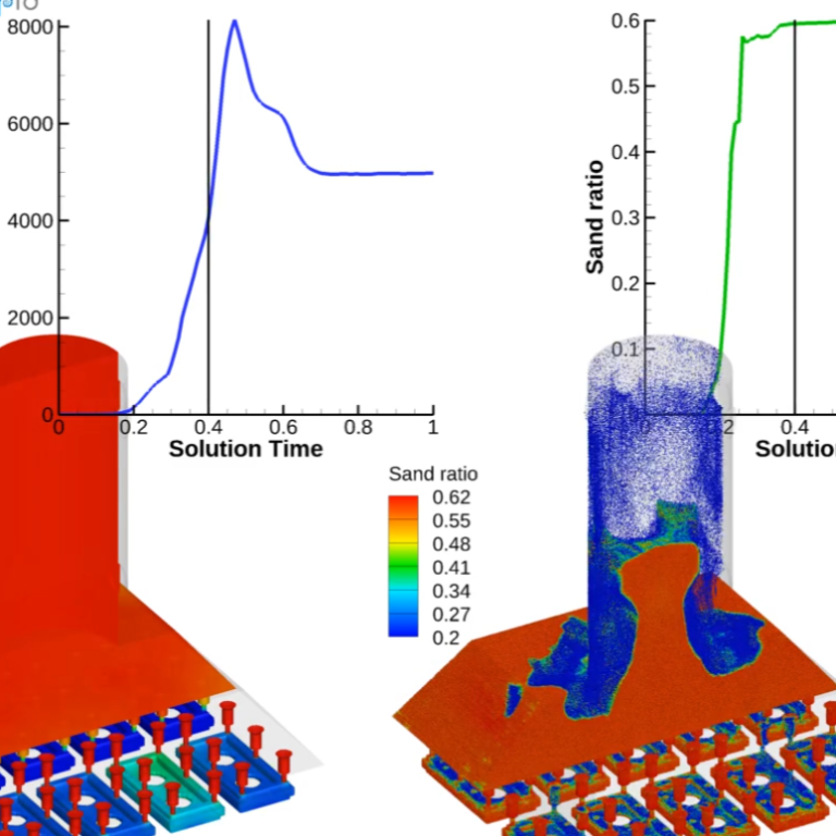 This video demonstrates the air-sand motion computed by Arena-flow for a magazine used to fill multiple sand cores. As the magazine pressurizes, the air drags sand into the core.