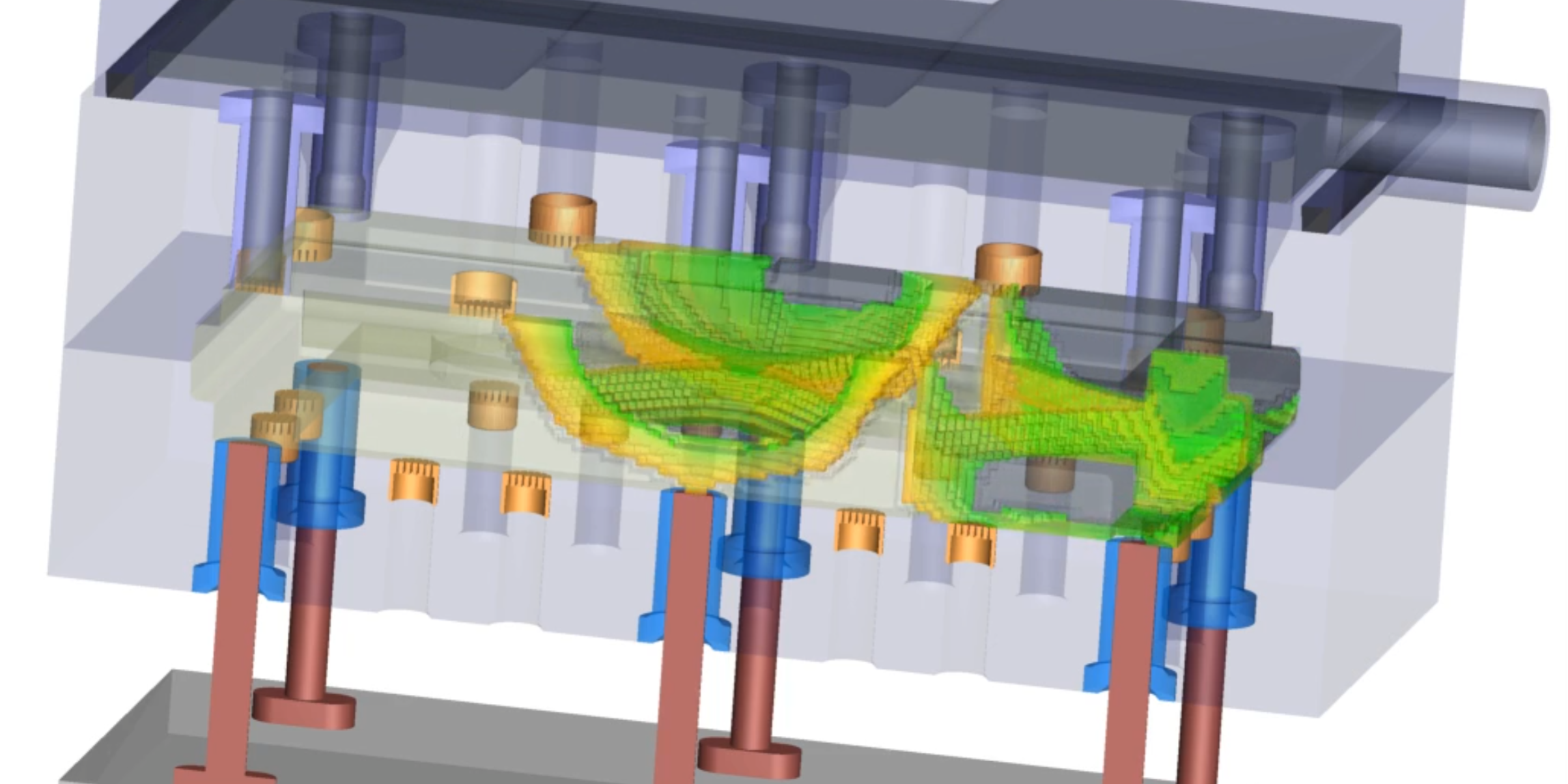 This video shows how a mixture of gas and air progresses inside a core box, as the sand has contact with gas, air, cured sand, in this instance cured sand is shown as transparent dark grey. It is possible to simulate the performance of a variety catalysts forcold box curing and the effect of purge air, using the transient curing module in Arena-flow.