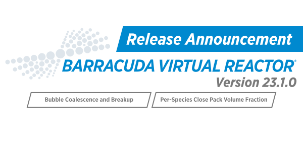 CPFD Software is pleased to announce the release of Barracuda Virtual Reactor® 23.1. This is a feature release that includes new physics models to more realistically model gas bubbles in liquid domains, as well as systems with multiple particle and bubble species that have distinctly different close pack volume fractions. New features in 23.1 include: